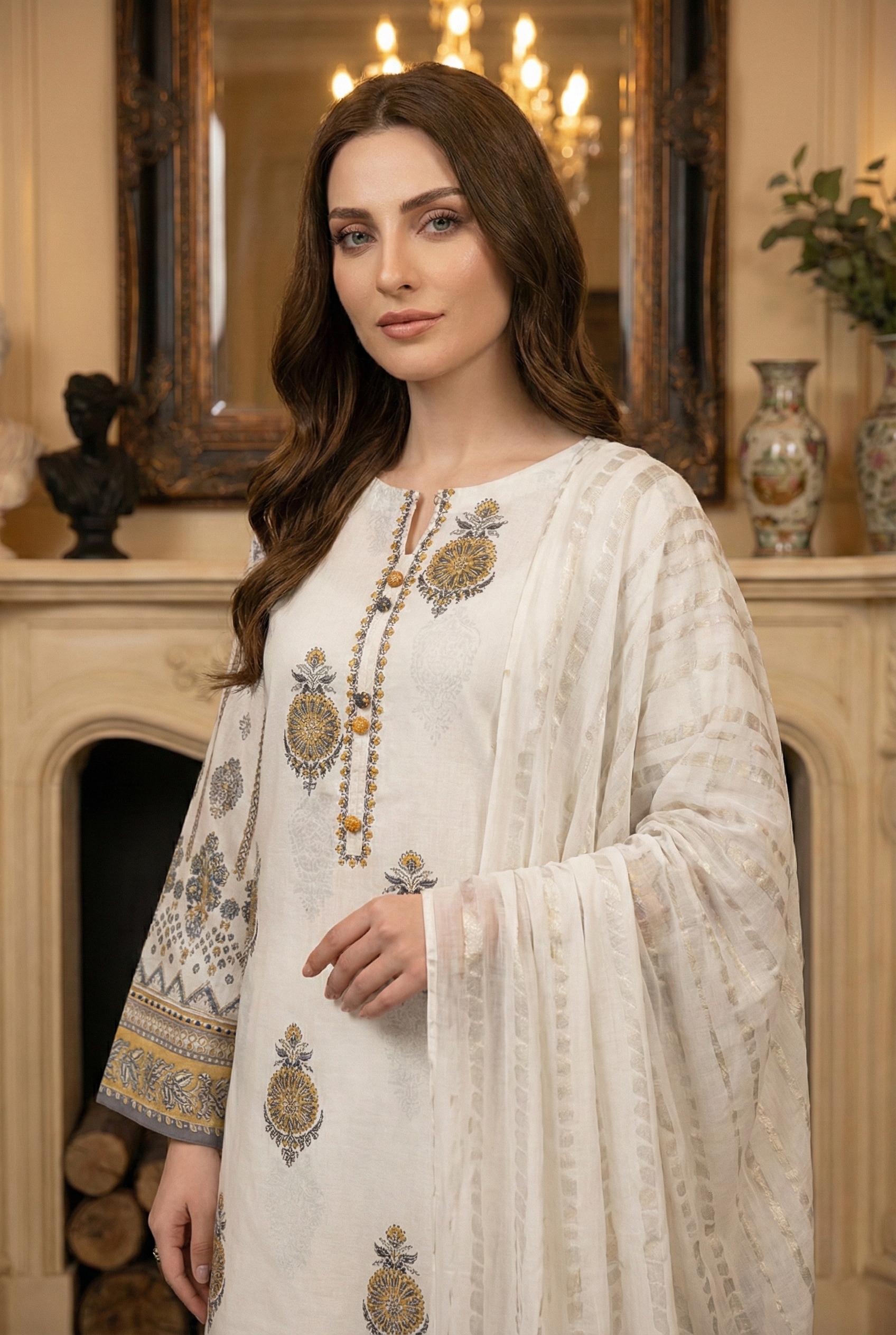 Paired with a soft lawn digital voile dupatta and plain dyed cotton trouser, it’s ideal for summer styling and everyday comfort.