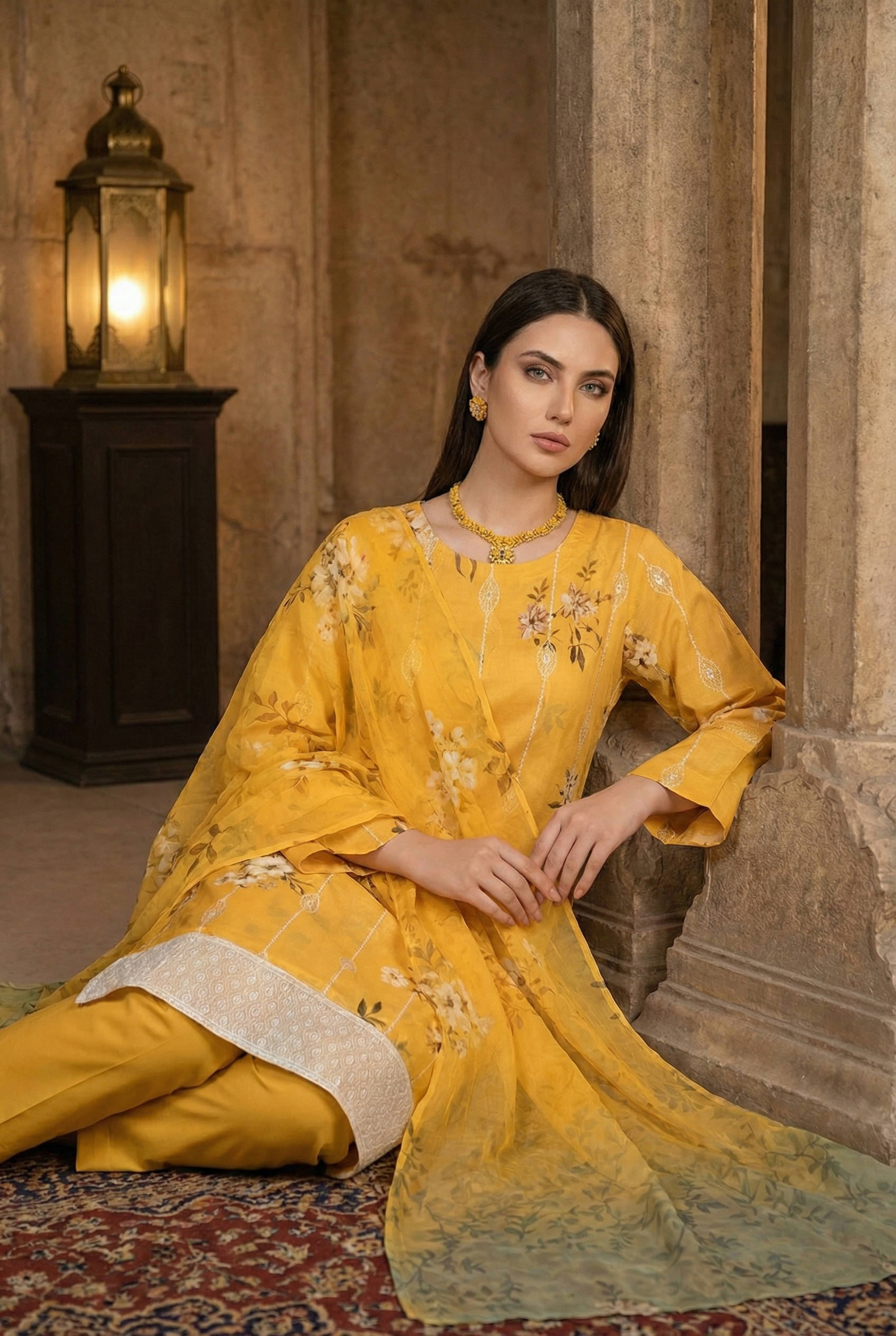 This digital lawn 3-piece suit blends modern prints with classic Schiffli embroidery for a refined summer look.