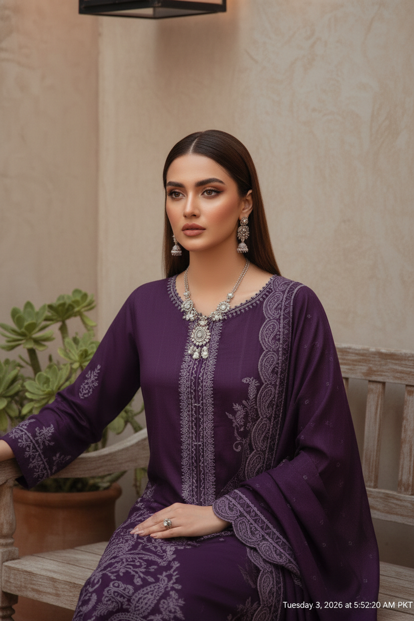 Rania’s Paisley Embroidered Slub Ribbon 3-Piece Suit is designed for women who want statement elegance with everyday comfort. Featuring a slub ribbon base with paisley embroidery on the neckline and daman, heavy embroidered sleeves, and a four-side detailed ready-to-wear lawn voile dupatta, this outfit creates a refined and graceful look. The plain matching trouser balances the design, making it perfect for festive gatherings, daytime events, and semi-formal wear.