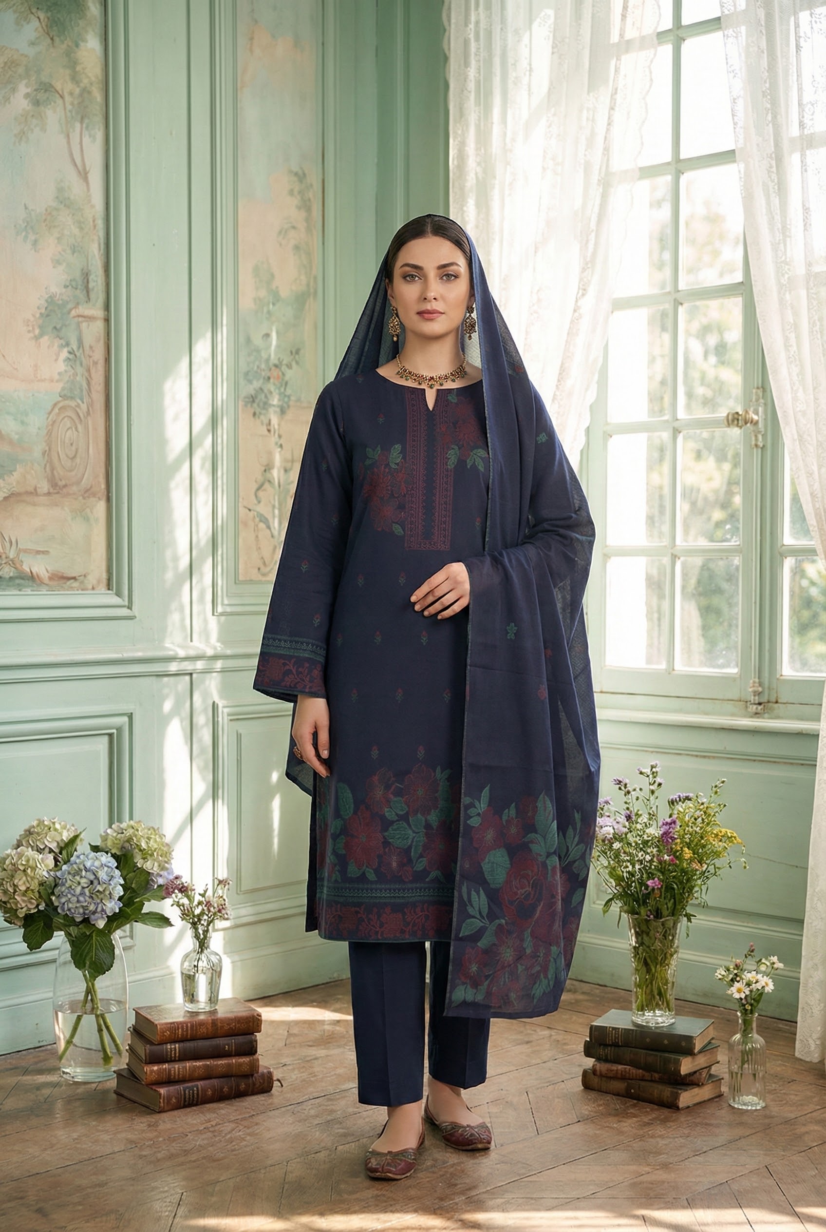 Designed for timeless sophistication, Rania’s Premium Brosha Jacquard 3-Piece Set showcases a digital-look jacquard weave shirt in stylish panel design. The coordinated pallu-style dupatta enhances the overall elegance, while the plain cotton matching trouser provides breathable comfort. Ideal for festive occasions and graceful evening wear.