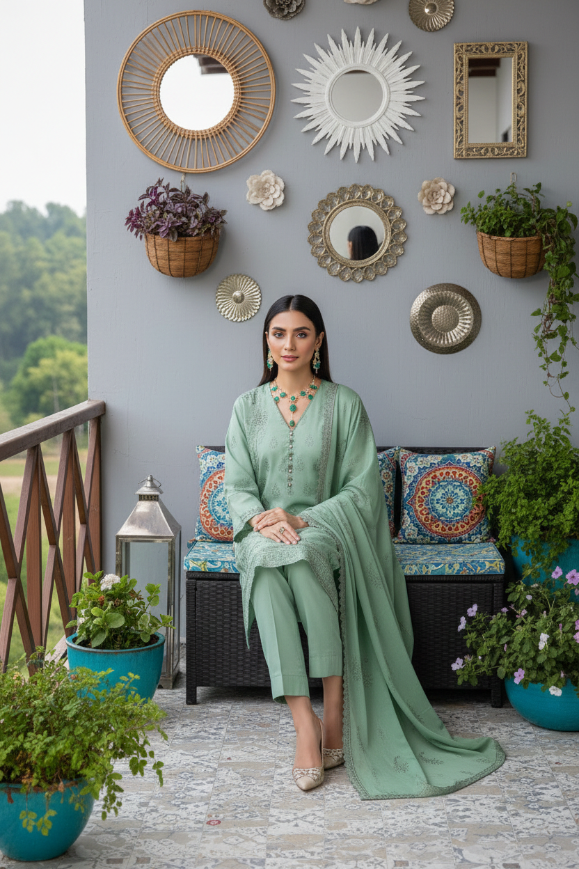 Rania’s Pure Cotton Paisley Embroidered 3-Piece Suit blends breathable comfort with graceful detailing. It features a pure cotton base with paisley embroidery on the neckline and daman, heavy embroidered sleeves, and a four-side embroidered ready-to-wear lawn voile dupatta with pallu design. Finished with a plain matching trouser, this outfit is ideal for festive wear, gatherings, and refined everyday styling.