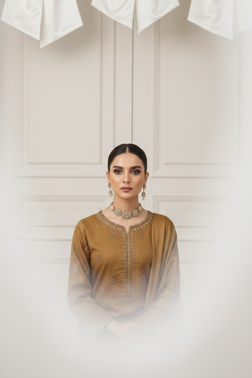Rania’s Self Lawn Doria Embroidered 3-Piece Suit is crafted for effortless elegance and seasonal comfort. The two-head embroidered shirt features a beautifully detailed neckline and daman, paired with a rich jacquard pallu shawl and plain dyed cotton trouser for a perfectly balanced look. Available in multiple colors, this ensemble is ideal for festive gatherings and refined daywear styling.